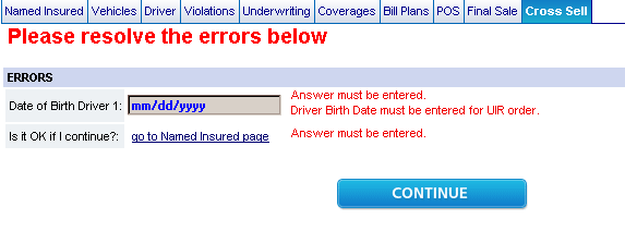 If you attempt to go to view Coverages or any tab after Coverages by using the "Continue" button or by clicking on a tab and a data error exists, the Error page will display with error messages. A descriptive message will appear if data is entered incorrectly or missing, and you will be able to correct the error on the screen. In certain cases, a link will appear to return you to the page where the information is incorrect or missing.